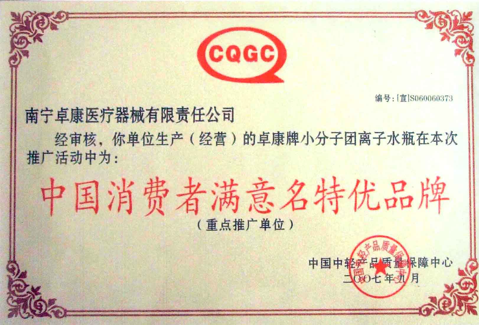 卓康牌離子水瓶榮獲中國名特優(yōu)品牌[點小圖見大圖]--------