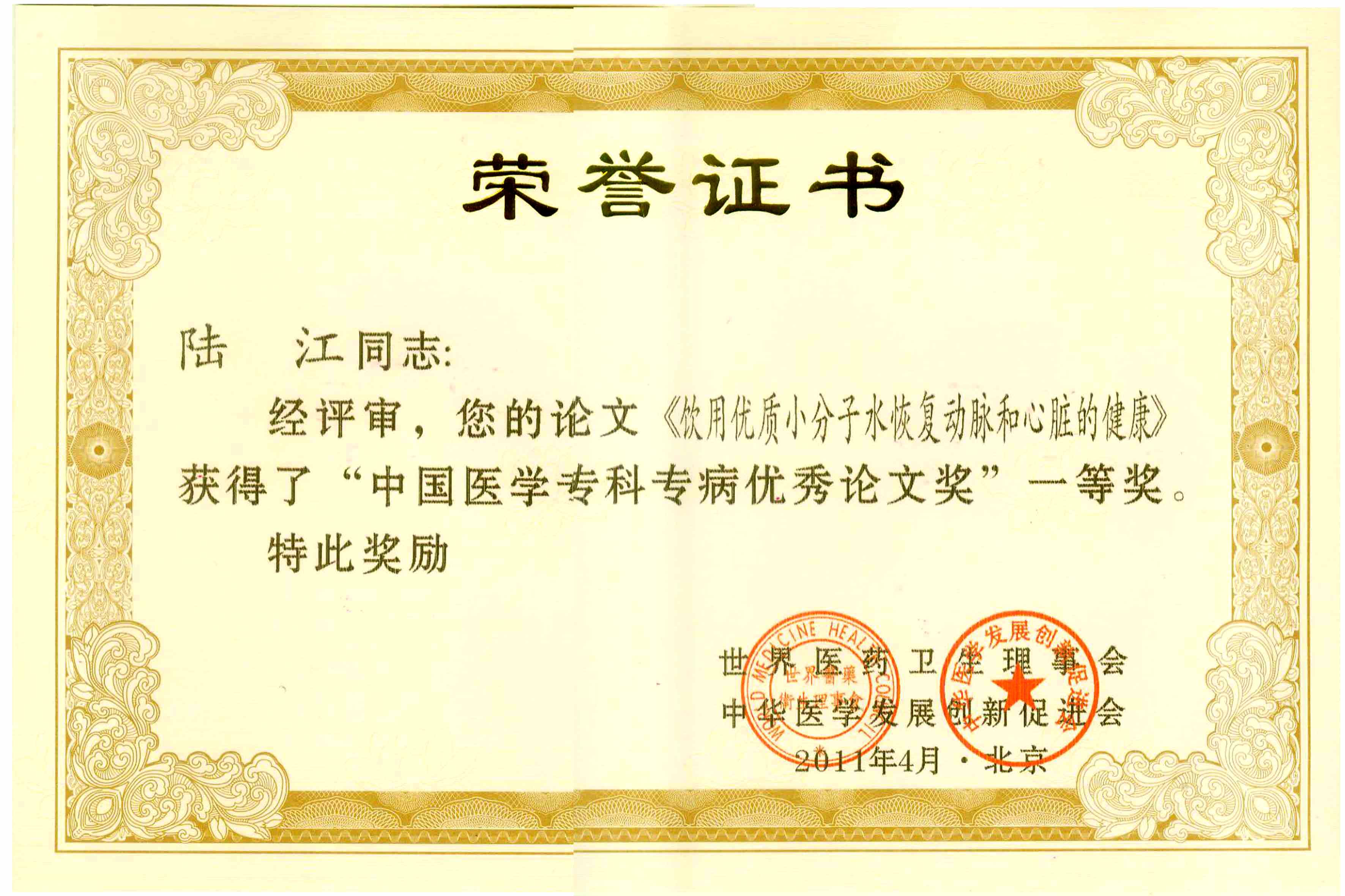陸江的論文獲一等獎榮譽證書-- 陸江論文獲創(chuàng)新論文獎牌