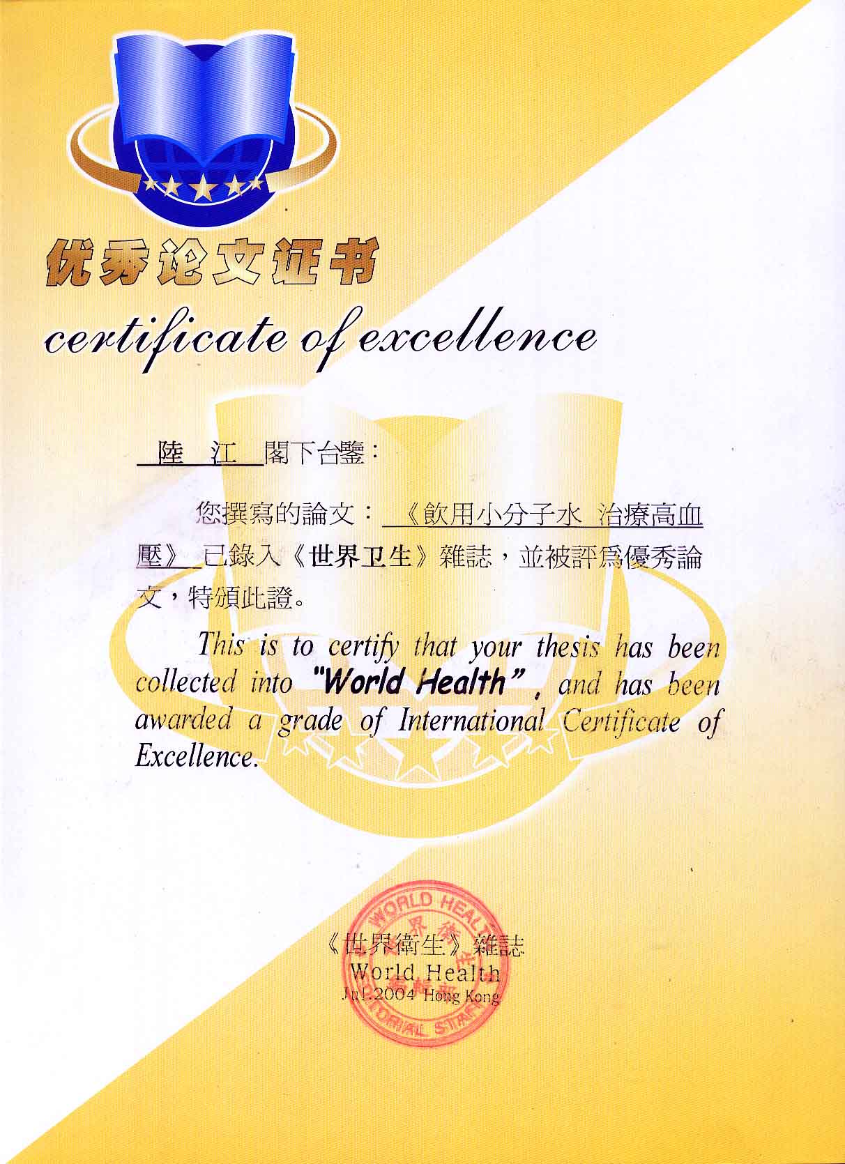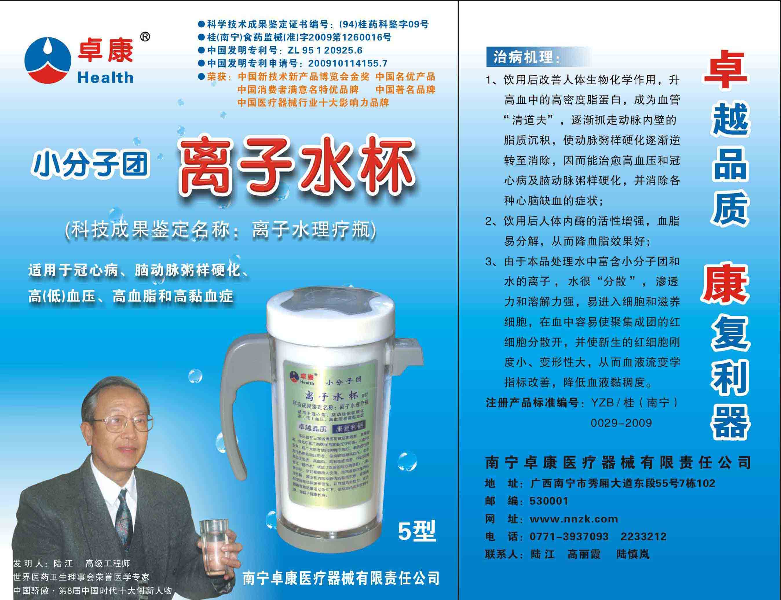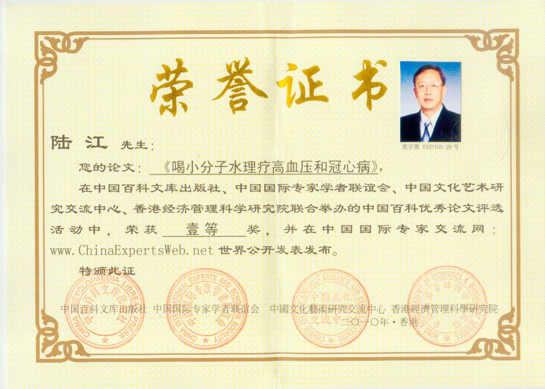 -----我是從事建筑的高工,本來沒有資格去攻克醫(yī)學難題,卻為了自身健康才扣響醫(yī)學的大門。由于我1990年患高血壓,因怕中風才研究發(fā)明了離子水瓶,我把水處理成微小分子團水,飲用后治愈了高血壓。便于1993年底送到三家省級醫(yī)院做臨床試用4個月。經(jīng)北京和廣西醫(yī)學專家鑒定:"降脂降壓效果好"," 能擴大心腦動脈流量,改善心腦電圖以及微循環(huán)","對治療心腦動脈粥樣硬化、高血壓、高血脂有良好的醫(yī)療保健作用。""產(chǎn)品的技術性能和療效達到了同類產(chǎn)品的國內(nèi)領先水平,經(jīng)廣西醫(yī)學科學情報研究所檢索,未見國外有類似報道。"中國醫(yī)學科學院張正國教授從美國國立醫(yī)學圖書館數(shù)據(jù)庫存Medline檢索英俄文資料,均未見類似報告。2000年上市后,我為了對消費者負責而繼續(xù)觀察研究,一直通過《信譽卡》和《質(zhì)量跟蹤調(diào)查書》向患者承諾療效,請用戶使用6個月后反饋效果。和脂壓患者飲用2至5個月內(nèi),消除癥狀,停服藥物,血壓正常;冠心病患者飲用3~5個月逐漸減輕至消除心絞痛、房顫等癥狀,不再服藥,飲用1年左右心電圖正常,經(jīng)冠脈造影掃描無明顯狹窄,表明冠心病痊愈。大量患者還反映許多衰弱器官被修復,讓前列腺增生、慢性咽喉炎、慢性氣管炎、支氣管炎、慢性胃炎、腸炎和膽囊炎等不藥而愈;2型糖尿病患者是因為胰島衰弱致病,飲用該水半年至一年,逐漸減藥至停藥,血糖尿糖正常,真正治愈2型糖尿病。中風后遺癥患者飲用六七個月,可逐漸減輕至消除肢體和語言障礙,表明飲用該水能讓壽命很長的神經(jīng)元細胞逐漸修復,奇跡般地恢復肢體和語言功能。飲用后還使胸腺和脾臟兩個重要的免疫器官被修復和增強,產(chǎn)生免疫細胞多,提高了免疫力,使人不生病或少生病。自此, 飲用微小分子團水創(chuàng)造了攻克冠心病、高(低)血壓和糖尿病三大醫(yī)學難題的奇跡。人們對此感到不可思議,但實踐是檢驗真理的唯一標準。