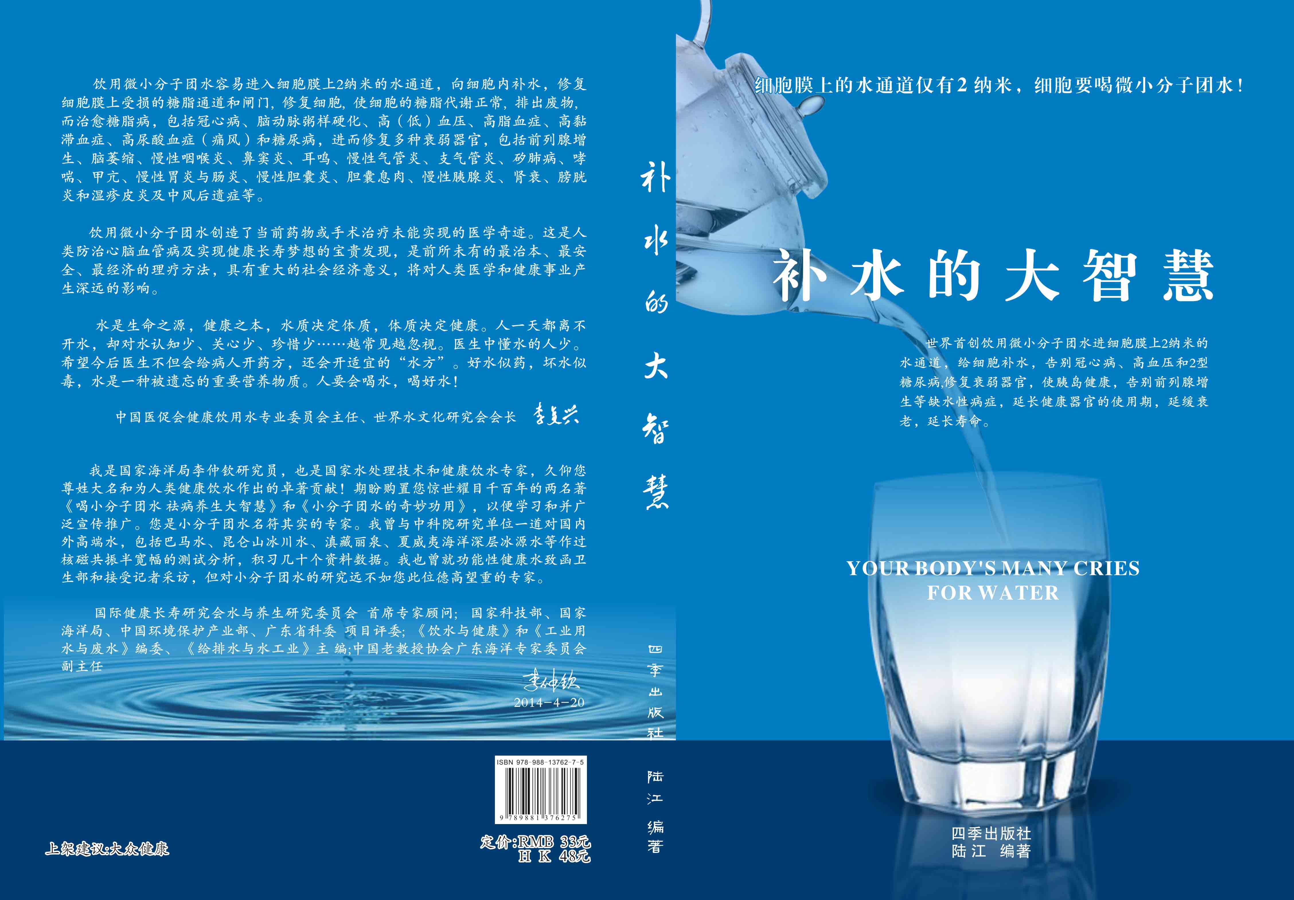 ----幾千年來,人們感到口渴才喝水,誤認為口渴是唯一的缺水信號,使喝水量偏少。很多人只知道補血補氣補腎補鈣補硒,而不知補水,逐漸使許多器官缺水,包括皮膚、動脈、氣管、膽囊、腸胃、骨關節(jié)、腎臟、前列腺和胰島缺水,以致患冠心病、高(低)血壓和糖尿病等缺水性病癥。美國F·巴特曼醫(yī)學博士寫有《水是最好的藥》一書很受歡迎,我國2007年譯成中文版,論述人體缺水引起許多病癥,他指導3000多患者喝水治愈了哮喘、胃炎和高血壓等病癥。而我是從2000年起,讓患者飲用微小分子團水,因為容易進細胞膜上2納米的水通道,治愈了許多缺水性的病。我跟蹤調(diào)查14年,發(fā)現(xiàn)凡是認真飲用和合理膳食,可治愈冠心病、高(低)血壓和2型糖尿病與衰弱器官并發(fā)癥及中風后遺癥。高血壓患者飲用2~5個月,癥狀消除,不再服藥,逐漸逆轉(zhuǎn)至消除動脈粥樣硬化,血壓正常穩(wěn)定,治愈了高血壓;冠心病人飲用3~5個月,消除心絞痛、房顫等癥狀,不再服藥,一年左右心電圖正常,經(jīng)冠狀動脈造影掃描表明冠脈內(nèi)無粥樣斑塊,真正治愈了冠心病;2型糖尿病人飲用3~10個月停藥,血糖尿糖正常,糖尿病痊愈。并且使前列腺增生、慢性咽喉炎、鼻竇炎、耳鳴、慢性氣管炎、支氣管炎、哮喘、矽肺病、慢性胃腸炎、膽囊炎、胰腺炎、腎衰、膀胱炎、風濕性關節(jié)炎、便秘、痔瘡和濕疹皮炎等不藥而愈,而無需終生服藥。飲用微小分子團水治愈的是長期吃藥治不好的病,彌補了幾千年來醫(yī)藥的欠缺,成為人類健康的寶貴資源。