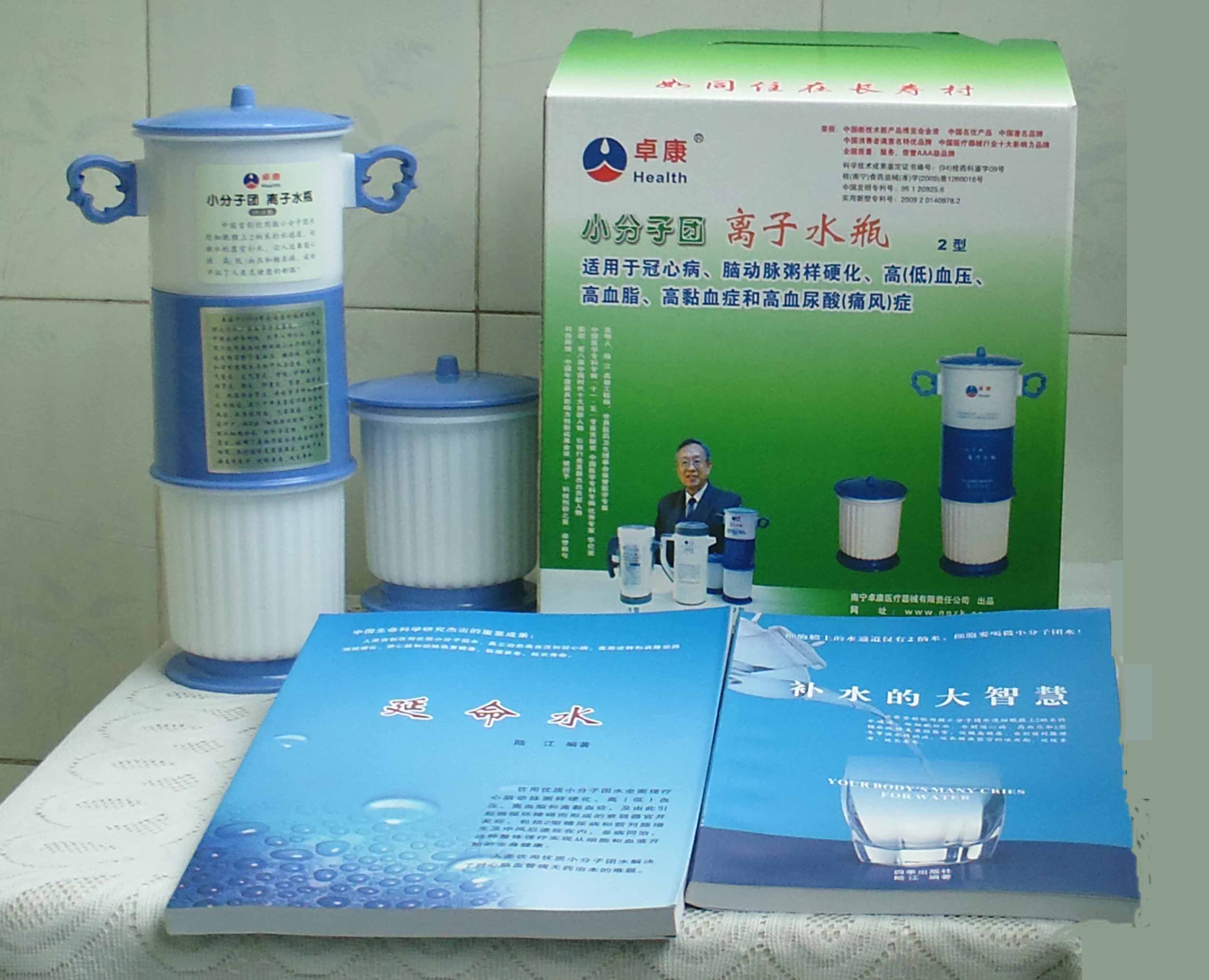 本品大量用戶的使用效果表明,能治愈冠心病、腦動脈硬化、原發(fā)性高(低)血壓、高血脂、高粘血癥、高血尿酸癥(痛風)和2型糖尿病、衰弱器官并發(fā)癥(前列腺增生、腎衰與尿毒癥)及中風后遺癥等療效好。產(chǎn)品配信譽卡。使用壽命30年,不換芯,易清洗。團購優(yōu)惠。從郵局匯款,匯費1%,地址按本頁下方地址、聯(lián)系人寫。從銀行匯款,請點擊[聯(lián)系匯款]欄,從工商銀行匯款,建設銀行、農(nóng)業(yè)銀行匯款,均免收匯費,匯款后20--30分鐘內(nèi)發(fā)短信,可用微信轉(zhuǎn)帳,均免匯費,微信號即手機號13768308380。匯款后,告知你的姓名和地址,我公司聯(lián)系人手機號是:13768308380。卓康牌離子水瓶為我公司獨家生產(chǎn),郵購產(chǎn)品配《補水的大智慧》彩印書一本,另配四季出版社出版的新書《補水的大智慧》一本,并配光盤一張(含央視主持人釆訪陸江的對話視頻)。目前市場和"淘寶網(wǎng)"上有人兜售假冒的偽品,望讀者審察辯別真?zhèn)危旒僬哓飧`假冒本公司的各種認證、獲獎獎項、專利號和外包裝盒上的中英文字,包括科技成果的鑒定意見等,請讀者注意防偽。如何識別假貨?已經(jīng)買了假貨怎么辦?(請點擊[打假掠影][打假掠影])。