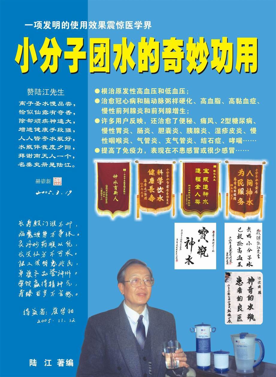 人類幾千年來患以上病癥需終生服藥,幾十年也不能治愈。可是我國南寧的高級工程師陸 江,于1990年想根治高血壓,研究發(fā)明了離子水瓶,處理出微小分子團水供飲用,經(jīng)過醫(yī)院臨床試用和專家鑒定,1999年獲中國發(fā)明專利權,產(chǎn)品于2000年投放市場后一直跟蹤調(diào)查,據(jù)全國各地用戶反饋:祛除了高低血壓、糖尿病和冠心病,并使前列腺增生、咽喉炎、鼻竇炎、慢性氣管炎、支氣管炎、矽肺病、哮喘、慢性胃炎、腸炎、慢性膽囊炎、慢性腎炎、腎衰、膀胱炎、便秘、痔瘡、風濕性關節(jié)炎和濕疹皮炎及中風后遺癥等病癥不藥而愈。為什么喝微小水能治20多種病?陸 江從1991年德國科學家發(fā)現(xiàn)細胞膜水通道僅為2納米獲得啟發(fā),認為多種器官患病是因細胞脫水,不能正常代謝和分裂增殖,才使器官細胞減少致衰弱萎縮而形成細胞缺水性病癥。22年來的實踐有力地支持了“細胞脫水致病”這一重要論點,表明喝微小水可滿足細胞的生理需求,補水就能祛病,是生命科學新亮點。